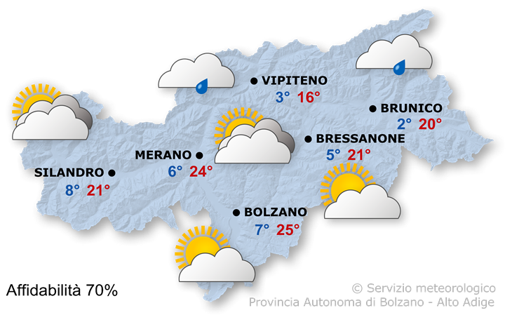 Temperature massime tra 16° in Alta Val d'Isarco e 25° in Bassa Atesina.